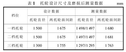 初次振動(dòng)時(shí),經(jīng)分析判斷,振動(dòng)原因是兩托輪磨損引起大、小齒輪齒頂間隙變小,造成頂齒。測(cè)量各檔兩托輪外徑之間距離,也確實(shí)比安裝時(shí)的變大了(見(jiàn)表1),且各托輪磨損情況也有差別。