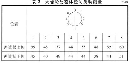 初次調(diào)整運(yùn)行3個(gè)月后,窯大、小齒輪又出現(xiàn)了間歇振動(dòng)現(xiàn)象,局部位置顫動(dòng)嚴(yán)重。起初我們?nèi)圆扇∩鲜鲛k法,甚至把三檔的托輪間距調(diào)到比安裝要求的略小一些,但效果仍然不好。由此判斷此次振動(dòng)絕非僅僅是因兩托輪之間距離變化引起的。于是停窯檢查大小齒輪嚙合情況,發(fā)現(xiàn)小齒輪的嚙合面距其齒根部10mm位置已磨出3~4mm的凸臺(tái)階。將窯打輔傳,焊臨時(shí)固定支點(diǎn)做測(cè)點(diǎn),通過(guò)測(cè)定彈簧板兩側(cè)位置的窯體徑向跳動(dòng)值,初步判斷大齒輪的徑向跳動(dòng)情況。